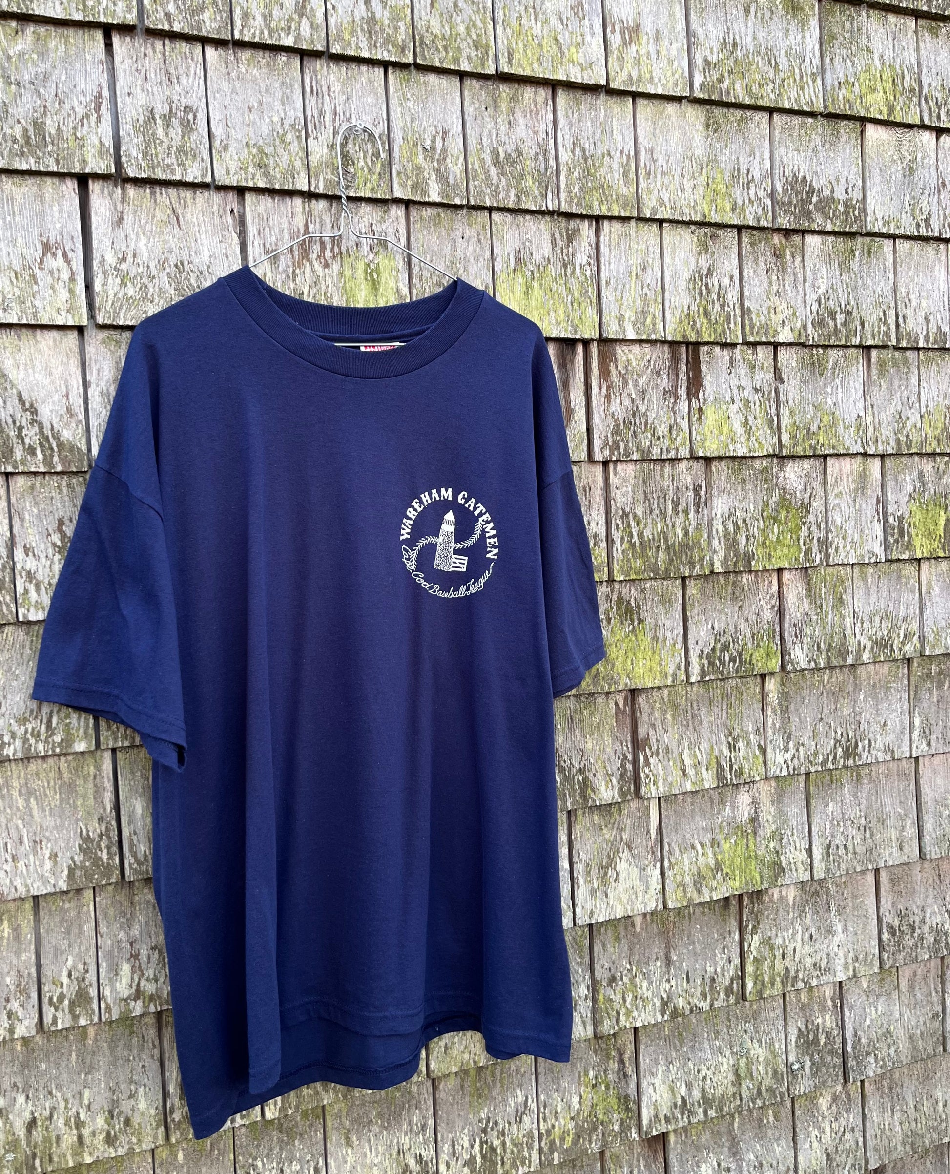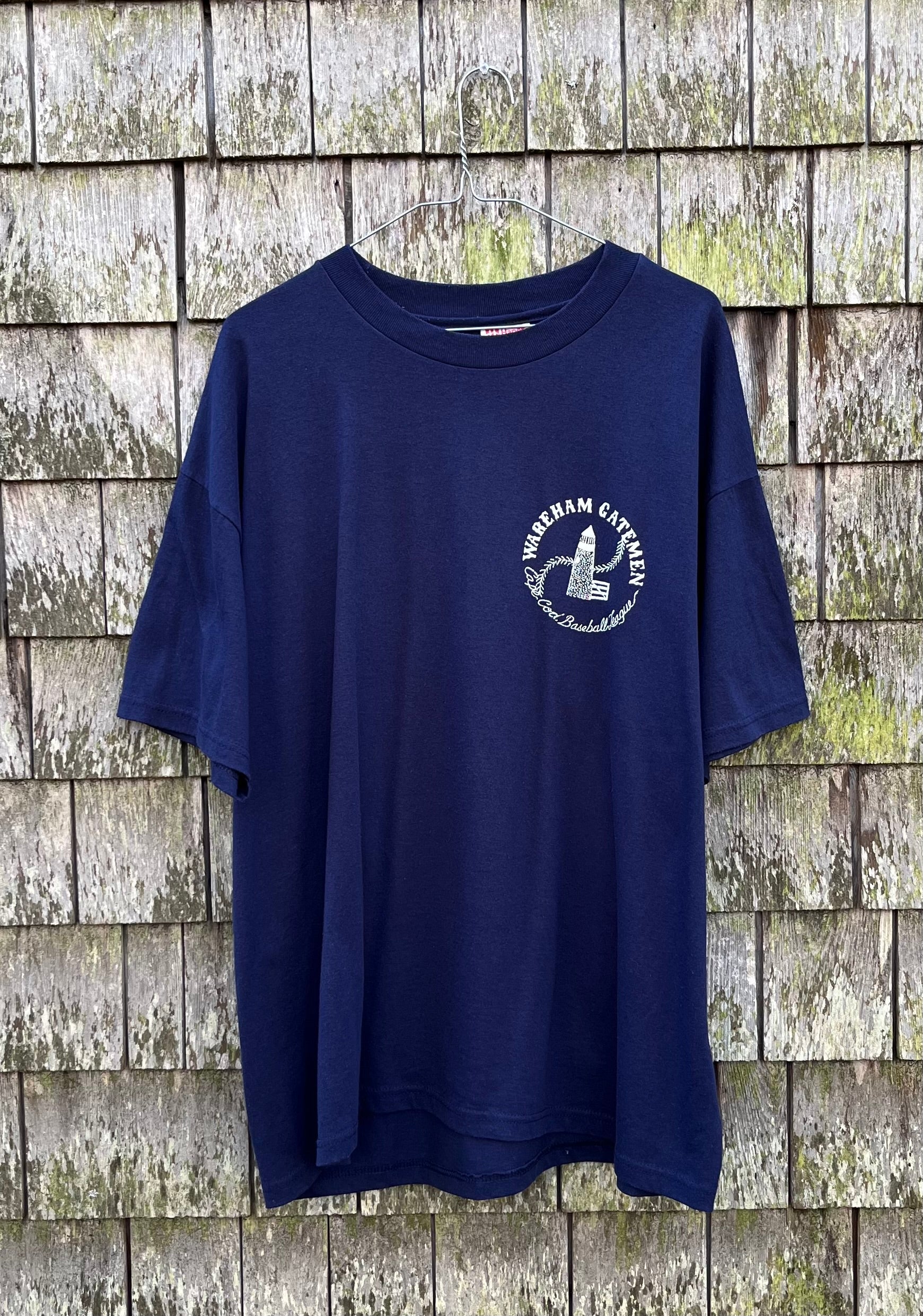 1990s Wareham Gatemen Cape Cod summer baseball league t-shirt. Navy with white print on chest. Hanes Heavyweight 50/50 cotton poly blend blank.
