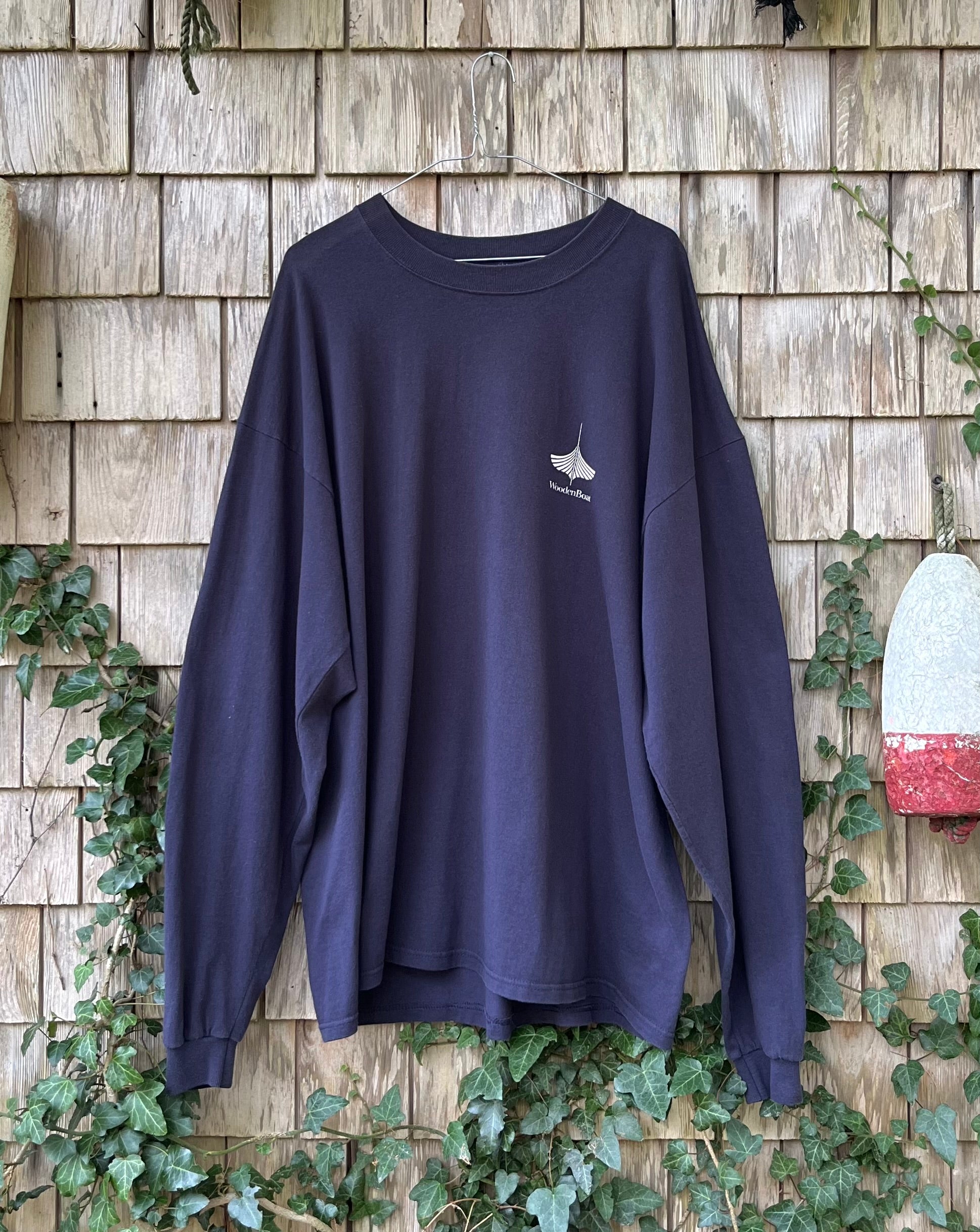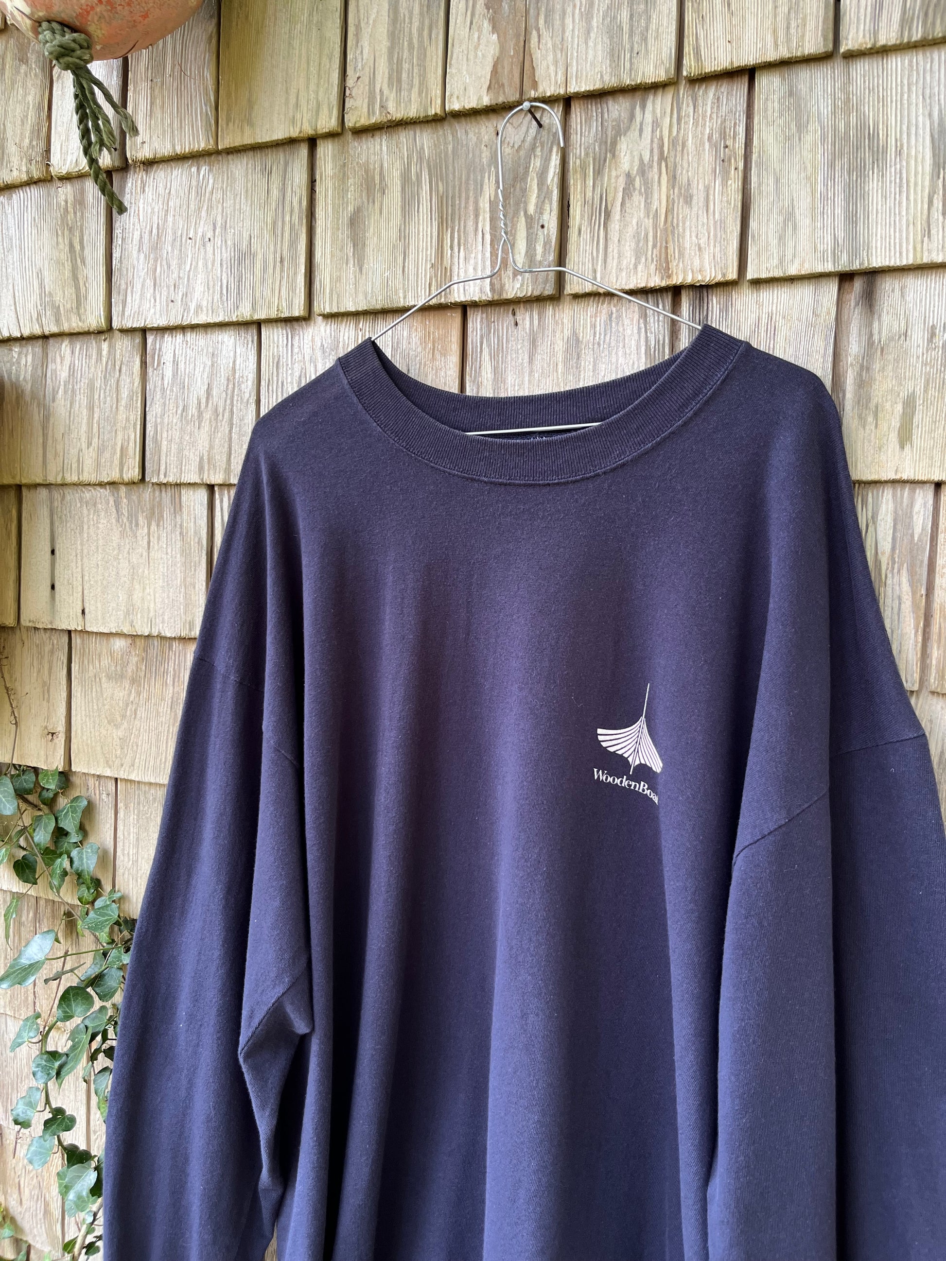 90s Wooden Boat Magazine long sleeve heavyweight t-shirt. Navy blue with white prints on chest and rear. Cotton Deluxe, 100% cotton blank.