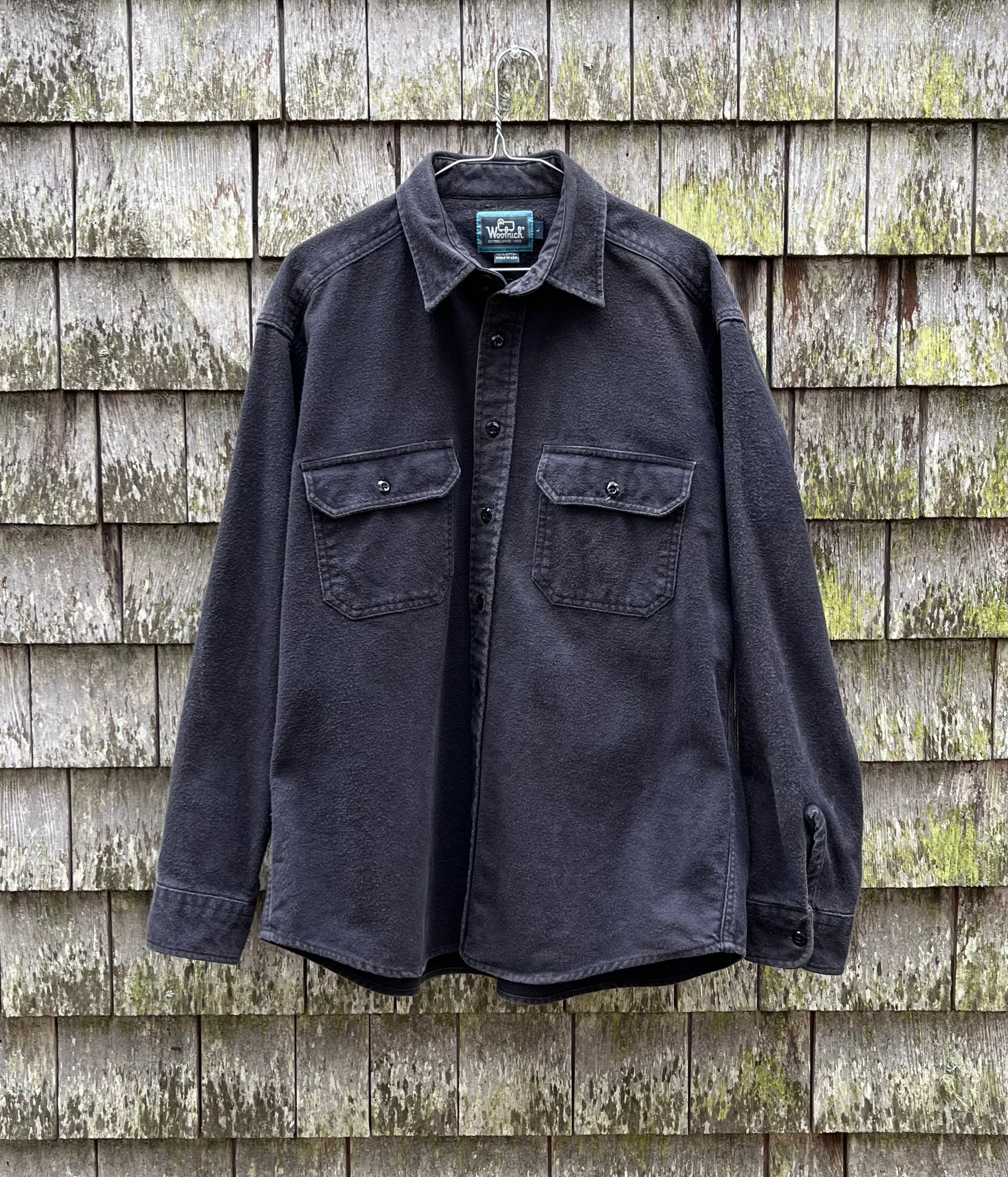 90s Woolrich chamois flannel shirt. 100% cotton. Black. Made in the USA.