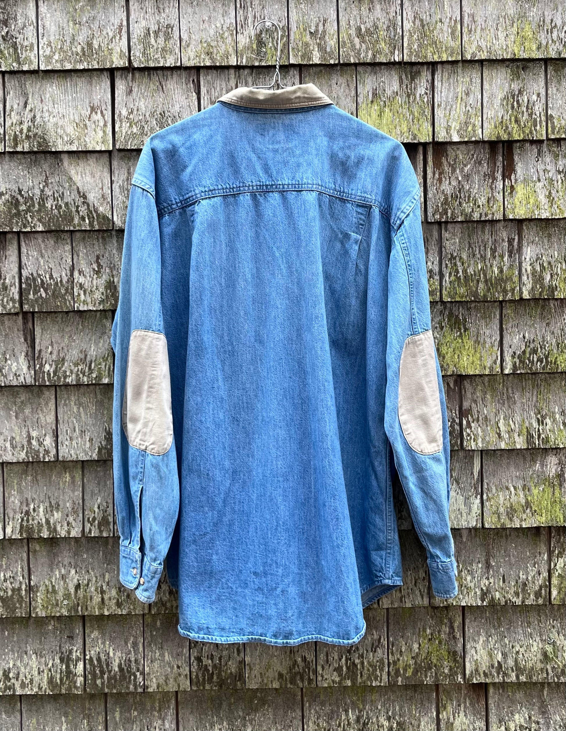 90s Woolrich button front denim shirt. Khaki twill patches at elbows and collar.