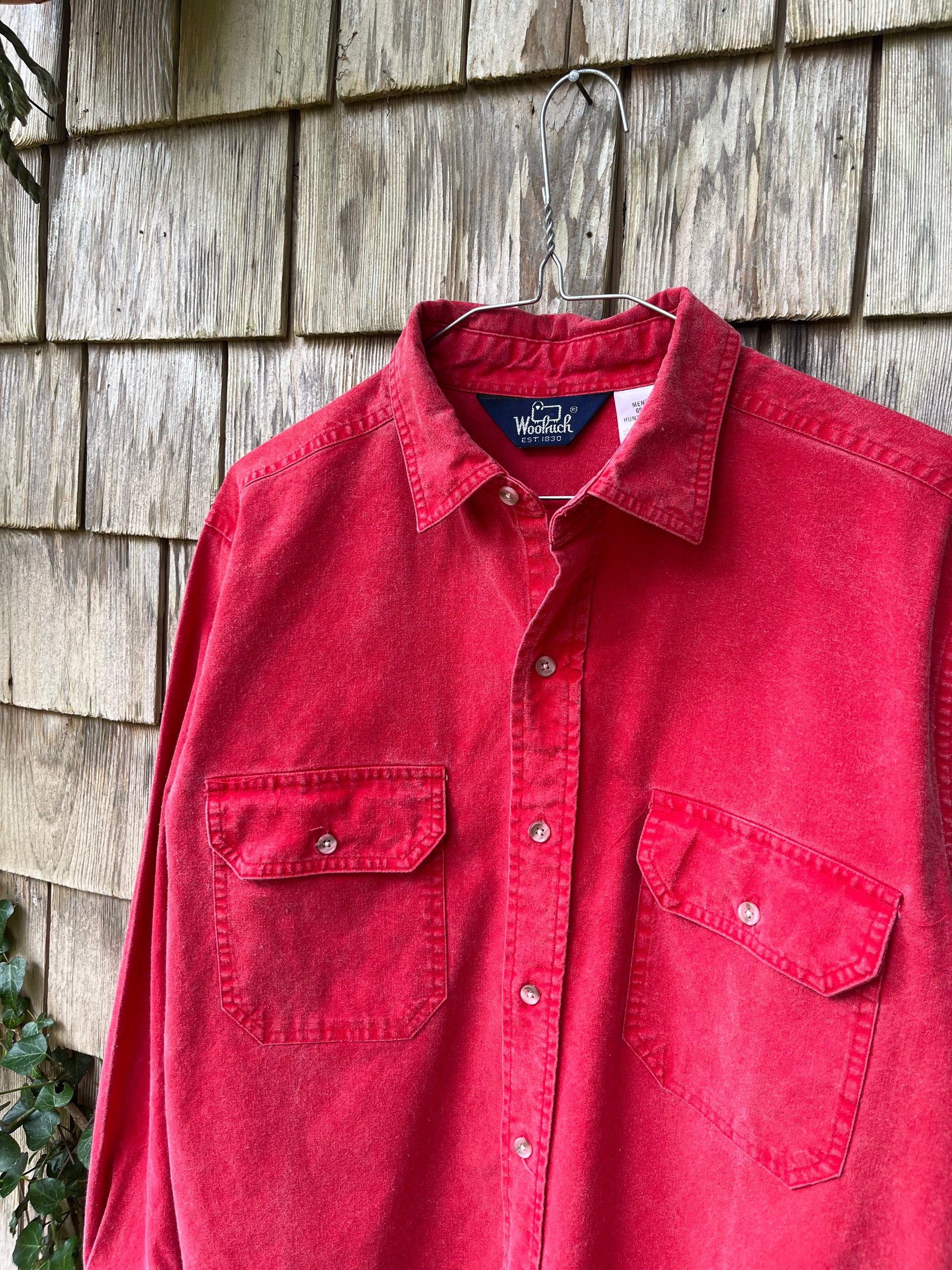 90s Woolrich garment dye cotton button front shirt. Nice lightly faded 'Hunting Red' pigment dye color. 100% cotton plain weave.